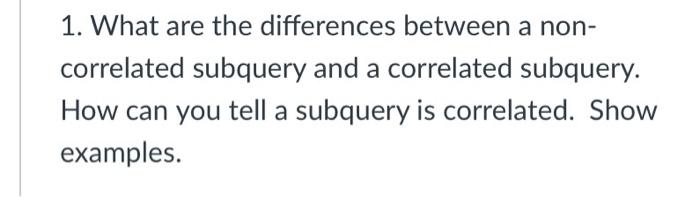 A noncorrelated simple subquery obtains its results independently of its containing outer statement. Explain the main difference between correlated and non-correlated subqueries. A Correlated subquery typically obtains values from its outer query before it executes.